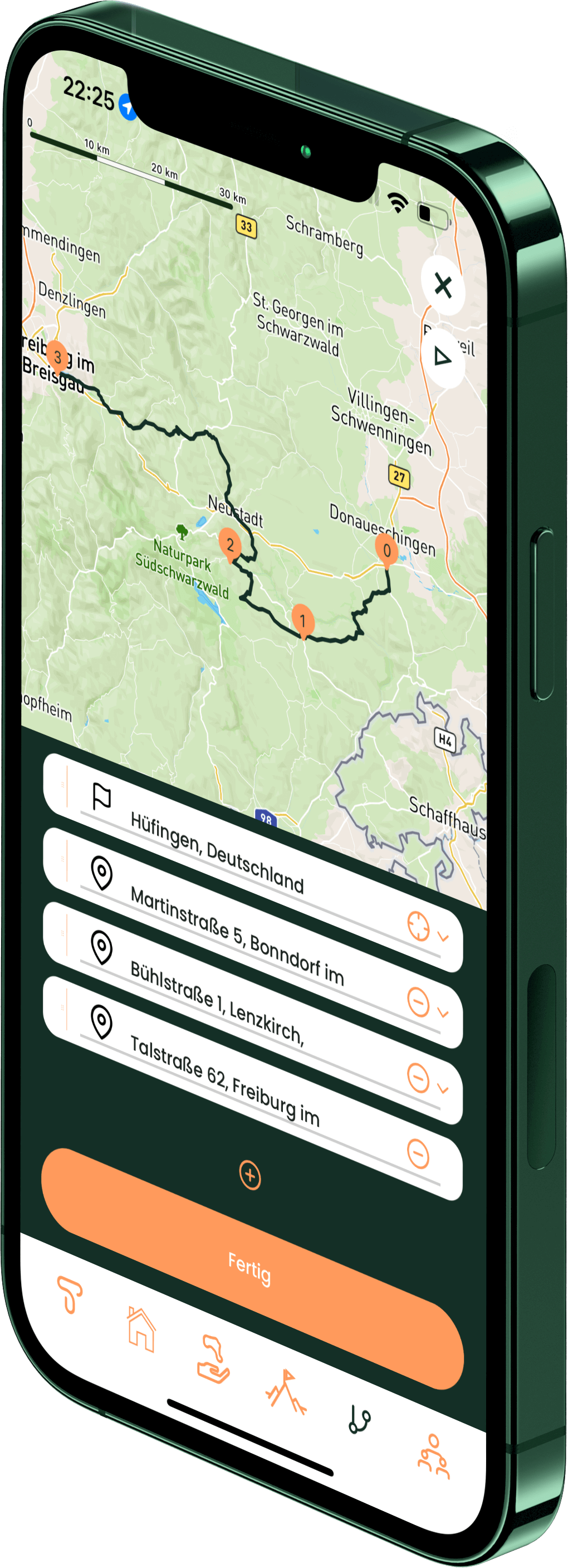 Erspar dir eine aufwändige Planung auf GoogleMaps. Wähle deinen Start und bestimme ob deine Tour "sehr kurvig", "kurvig", "kurvig und schnell" oder einfach nur "schnell" sein soll. Wähle deine Stationen und dein Ziel und schon geht’s los. Du kannst deine Touren jederzeit speichern und mit andern teilen